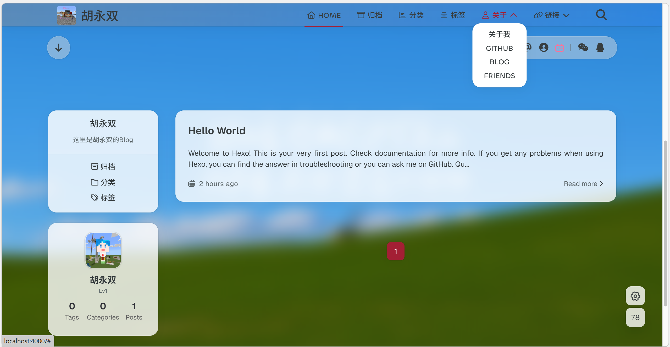 下图中“主页”为英文,可以在Hexo配置文件(_config.yml)中修改language配置为:language: zh-CN即可,修改配置后,设置的英文导航栏名称也会翻译为中文。