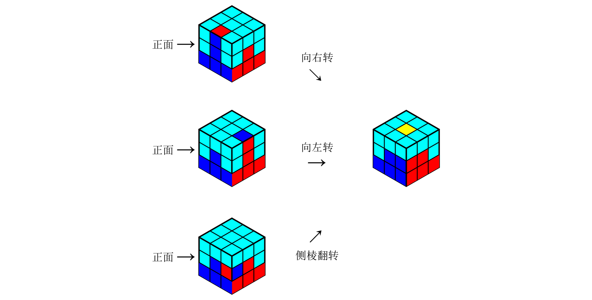 如下图,还原中层分为向右转、向左转和侧棱翻转三种情况。(还原中层可使用的公式有很多,大家可选择自己合适的公式来练习。)