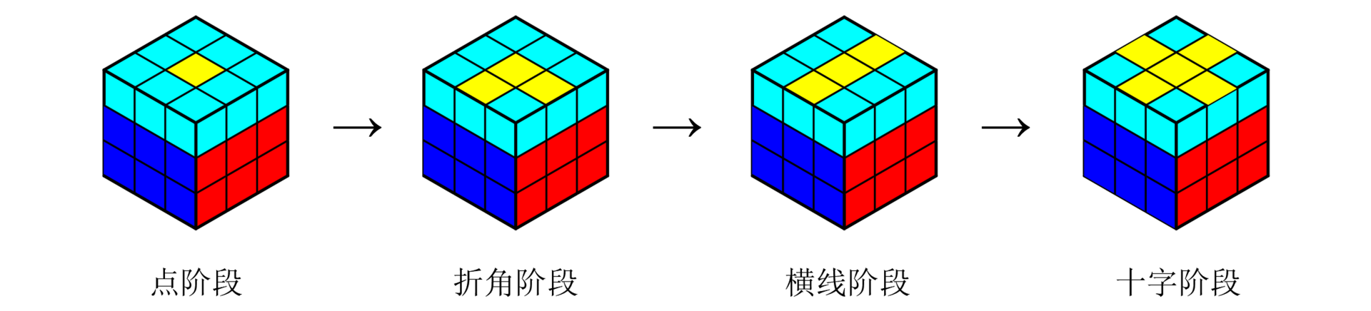还原顶面十字包括点阶段、折角阶段、横线阶段和十字阶段(最终阶段)。