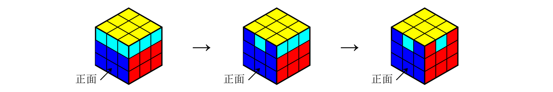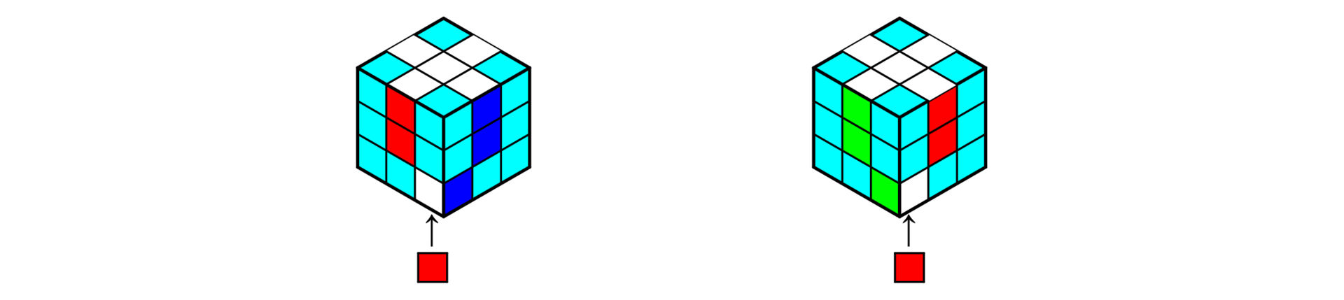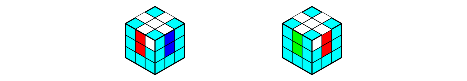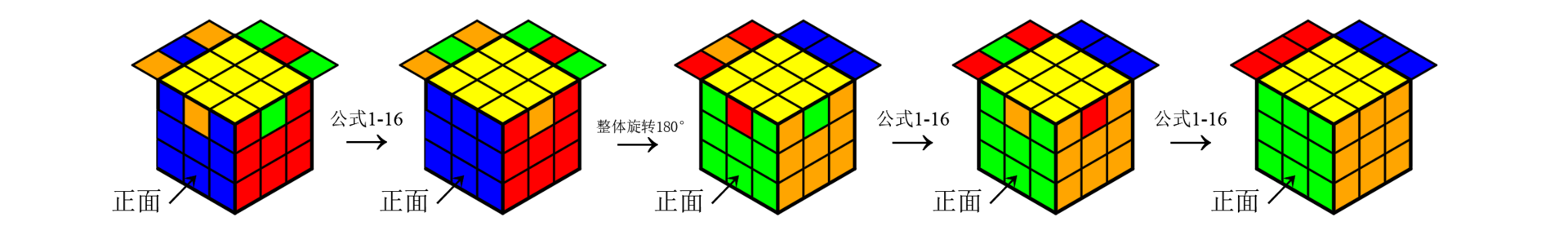 2. 如果顶层侧边不存在中棱颜色与左右两角块颜色相同的面,就将任意一个面作为正面,使用公式1-16后,会出现顶层侧边颜色对齐的一个面,把这一面的背面作为正面,使用公式1-16还原。