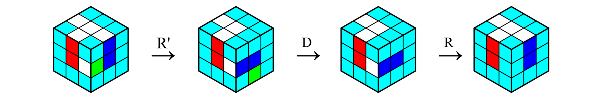 2. 找到颜色为白色和与侧边中心颜色相同的颜色的棱块,只使用公式R、F、B、D(和其逆)将其移动到顶面,注意不要打乱已经与侧边中心对齐了的棱块;