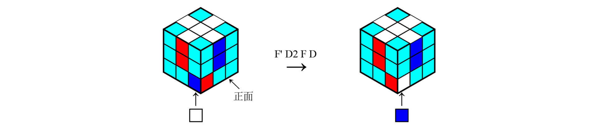 旋转底层,将白色面旋转到正面,角块右侧(左侧)颜色与右侧面(左侧面)中心颜色一致,角块底面颜色与正面中心颜色一致,使用公式1-3还原。